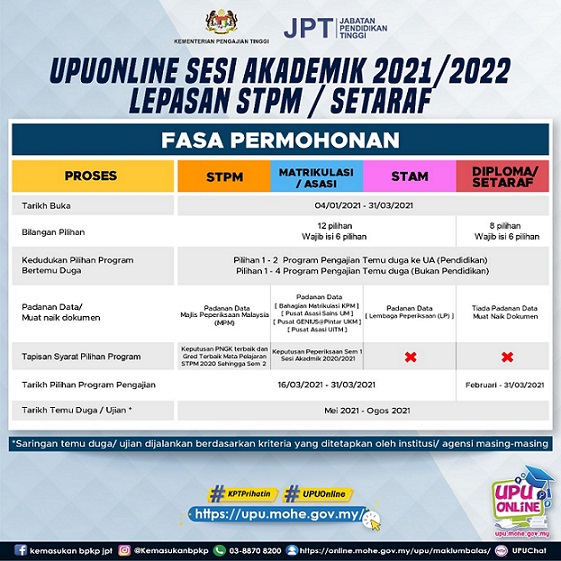 Panduan dan Syarat Am Permohonan UPU Online. Tarikh-tarikh Penting Kemasukan Pelajar Lepasan SPM dan STPM atau Setaraf Sesi Akademik 2021 2022. 18 hingga 20 Jun 2021.