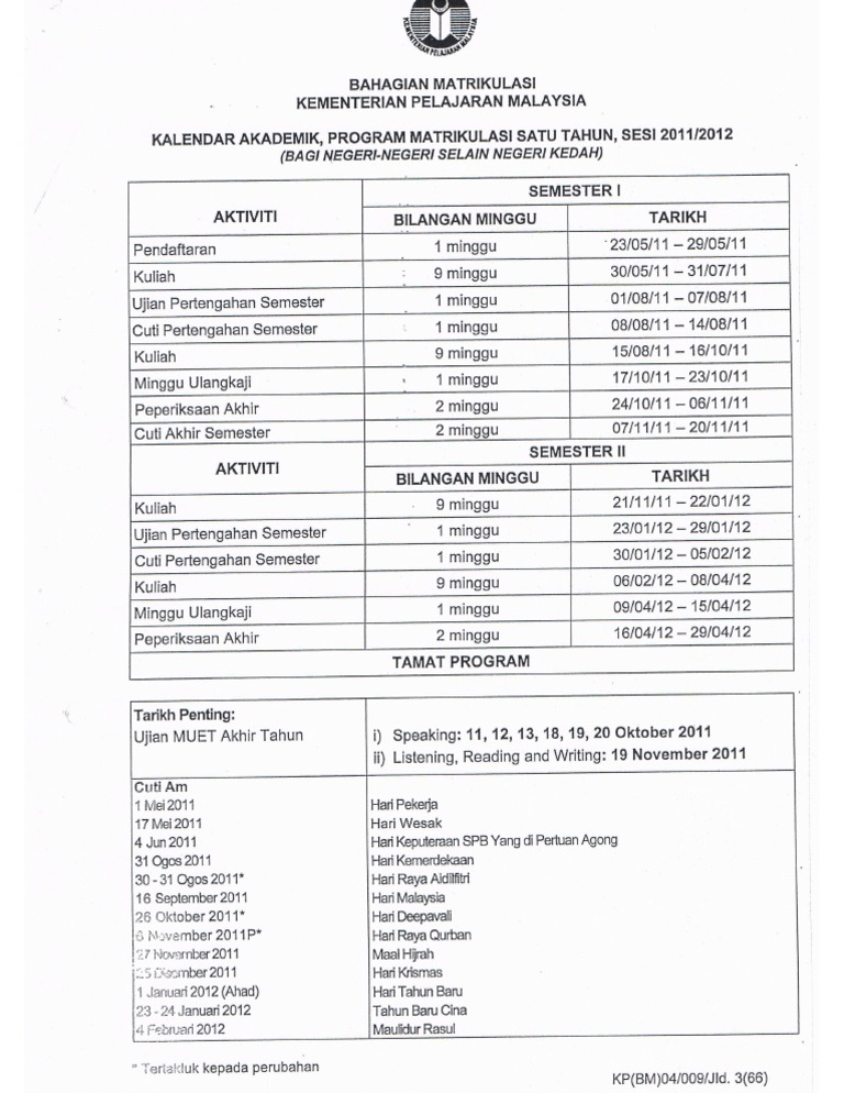 Kalendar Akademik Pst Program Matrikulasi Satu Tahun Sesi 2011 2012 Pdf