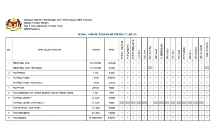 Senarai Cuti Umum Malaysia 2021 Persekutuan Negeri